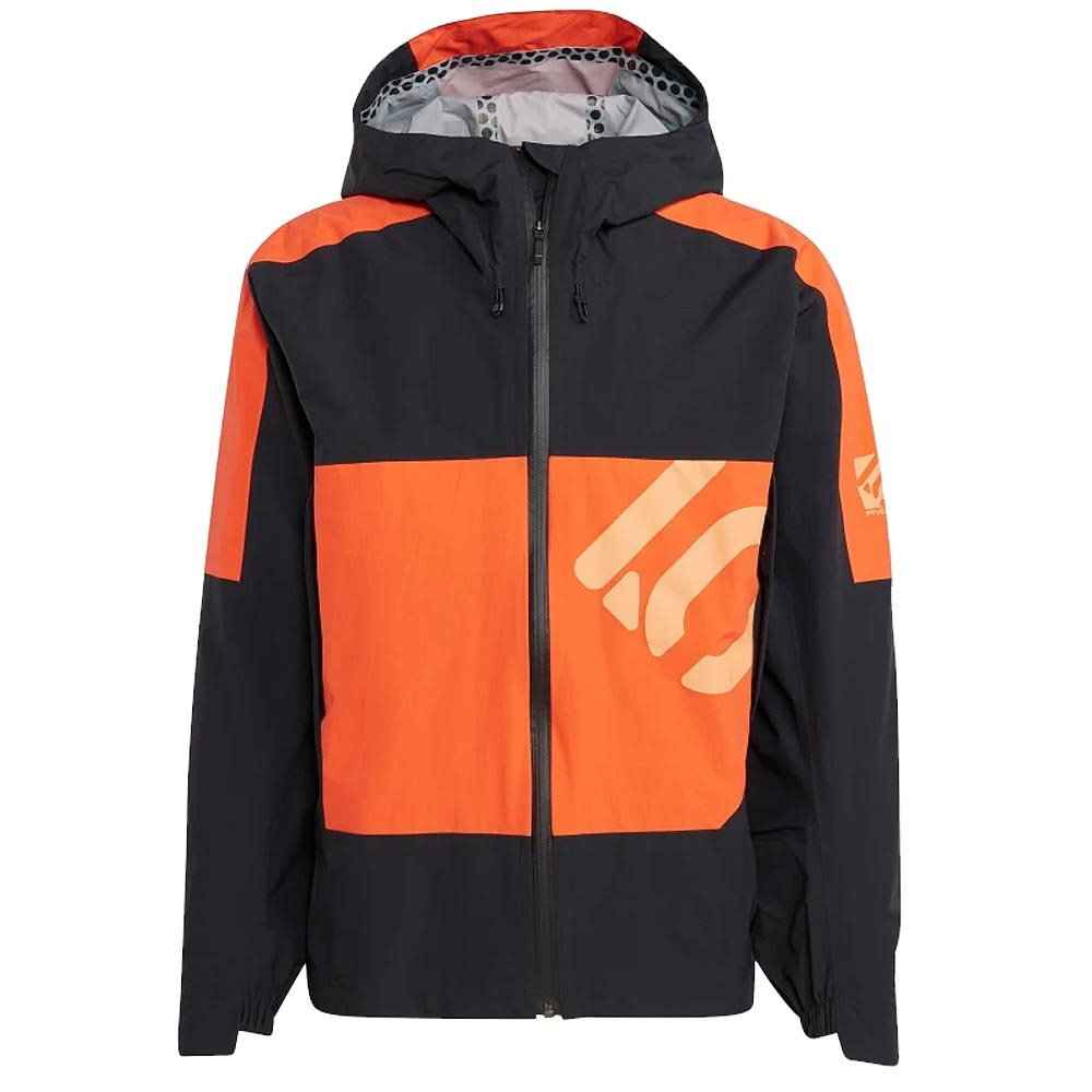 Five Ten All-Mountain Rain Jacket Black/Semi Impact Orange: Cool misty morning or afternoon showers, the adidas Five Ten All-Mountain Rain Jacket keeps you dry and on the bike. RAIN.RDY keeps out wind and rain, while elastic cuffs, hem and hood further seal out the elements while you ride. Its lightweight build makes for easy packing. Zip out the showers and keep on riding.
