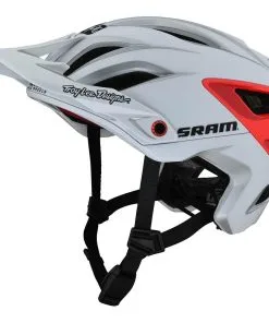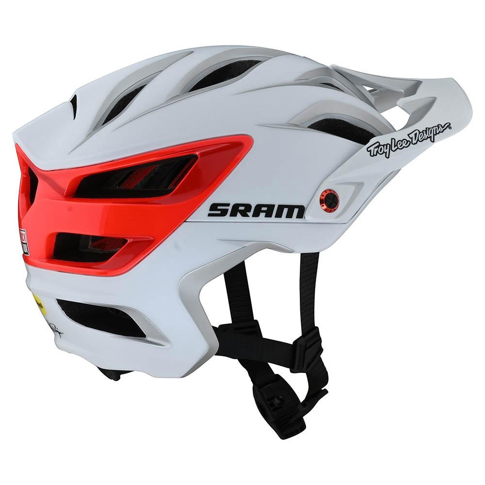 Troy Lee Designs A3 MIPS Helmet SRAM White/Red: The all new A3 MIPS open face helmet by Troy Lee Designs for all MTB/enduro trail riders who want a cool and fast helmet with deep coverage. The retention system is the TLD V3 with a micro adjustable ratchet system and a V2 Fidlock magnetic buckle. The internal padding is made out of sweat-absorbing anti-odor X-static liner. The visor is 3 position adjustable and has a magnetic system for secure goggle storage.