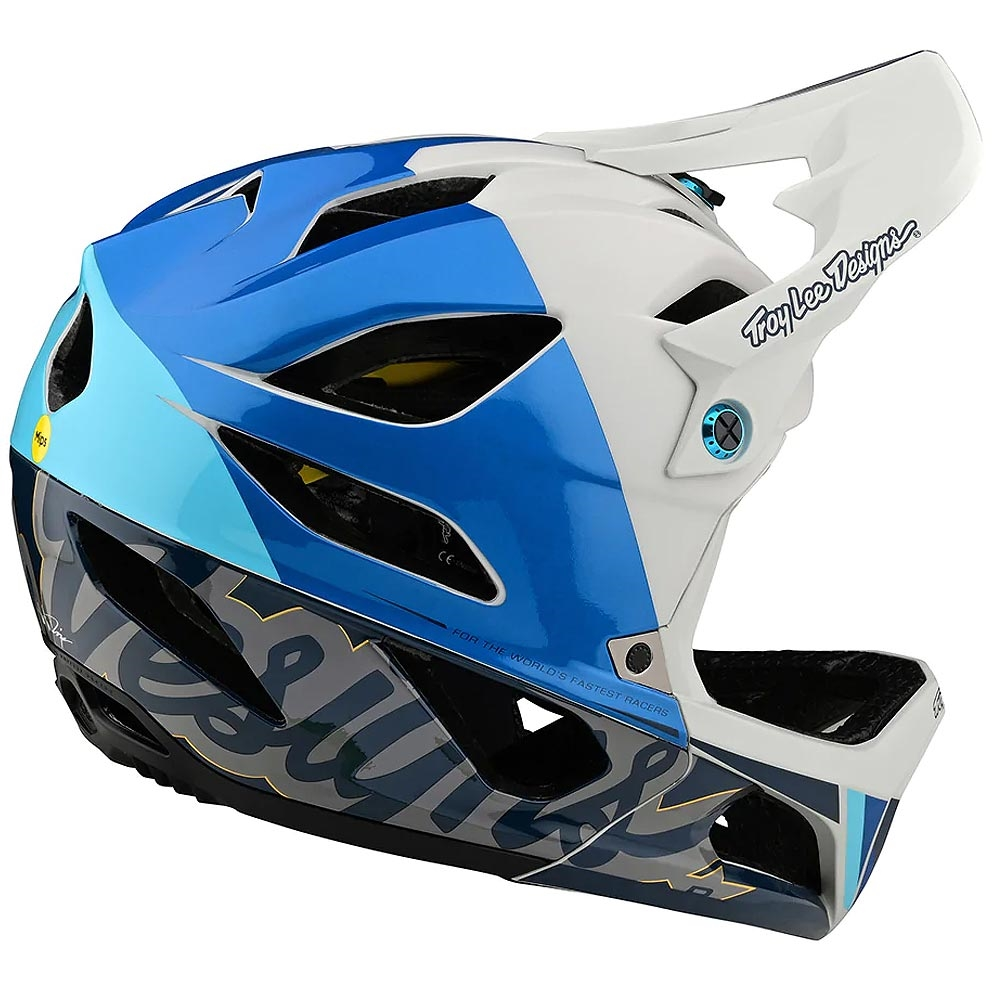 Troy Lee Designs Stage MIPS Helmet Nova Slate Blue: The all-new Stage helmet redefines mountain bike safety, style, comfort and ventilation. The lightest full-face helmet in its class combines EPP (for slow speed impacts) and EPS (for high speed impacts) in one sleek package, that will set a new benchmark for mountain bike enduro helmets.