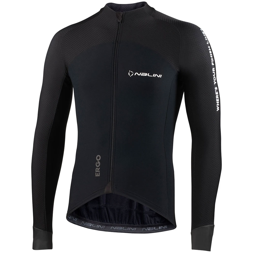 Nalini ERGO XWARM LS Jersey: Nalini ERGO XWARM Long Sleeve Jersey is an essential piece for cool weather riding. The textured 3D surface fabric in the upper body and sleeves provides superior aerodynamic properties and water repellency. The soft hollow-fiber inner layer creates the perfect insulating shield that keeps you warm while pushing moisture away from your body for rapid evaporation. Nalini ERGO XWARM features a full-length zipper for additional ventilation and three easy-access rear pockets for your stash. Where’s your finish line? is printed on the left upper sleeve.