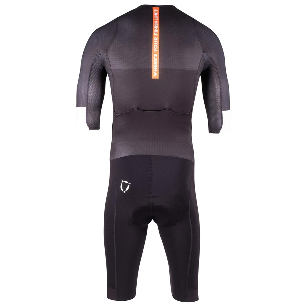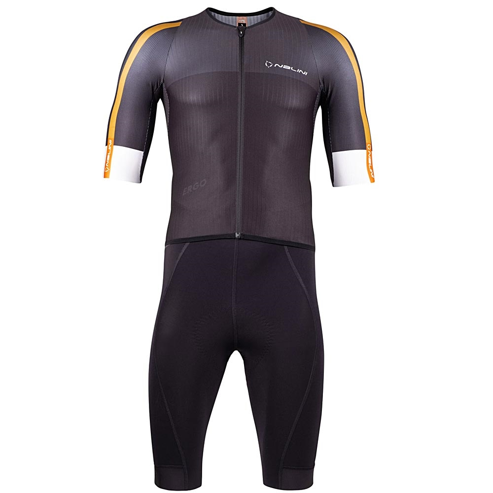 Nalini Veloce Race Suit: Ergonomic and Aerodynamic skinsuit, with a striped fabric on sleeves and frontal part and a super lightweight fabric on the back. Clean Cut on sleeves. On the lower part an abrasion-resistant Kinetech fabric with compression properties and + 50 UV protection. Maximum breathability on the upper part and practical horizontal opening. High visibility reflective details.