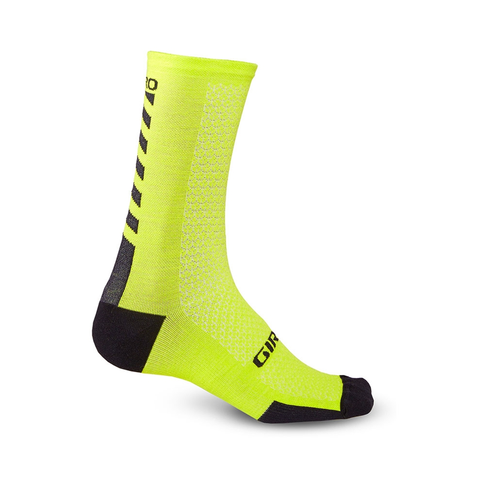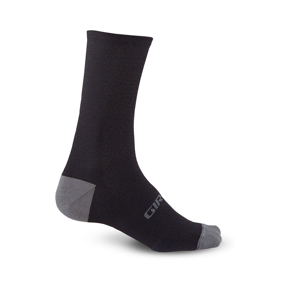 Giro HRC Plus Merino Wool Sock: The HRc+Merino wool sock has become Giros most-loved sock for riders who demand performance. It is now available with a core spun Meryl Merino wool yarn that adds the soft touch of wool for mountain biking and some warmth for cool weather riding. The compressive qualities promote increased circulation with greater arch support, and the extra reinforced toe and heel improve durability. With a 7 cuff height, you have protection on the trail and warmth when the weather gets cool.